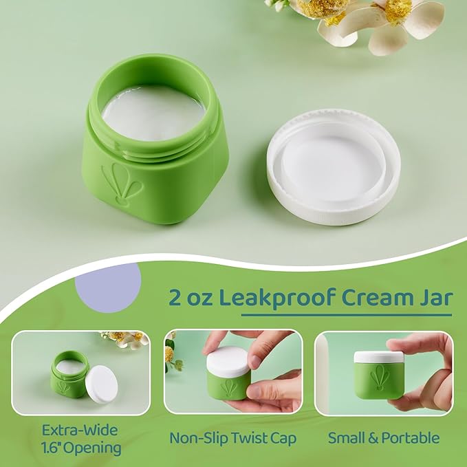 - 2oz Wide-Mouth Silicone Cream Jars: Extra-wide 1.6-inch opening (4cm) allows easy scooping with fingers or spatulas, paired with anti-slip screw lids for leakproof storage of thick creams, balms, or serums. INSFIT small travel containers for creams are your ideal travel accessories.