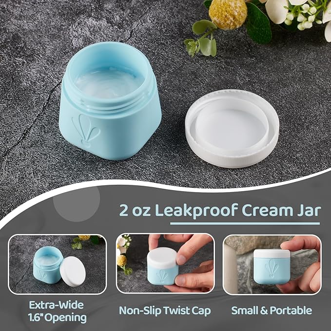 - 2oz Wide-Mouth Silicone Cream Jars: Extra-wide 1.6-inch opening (4cm) allows easy scooping with fingers or spatulas, paired with anti-slip screw lids for leakproof storage of thick creams, balms, or serums. INSFIT small travel containers for creams are your ideal travel accessories.