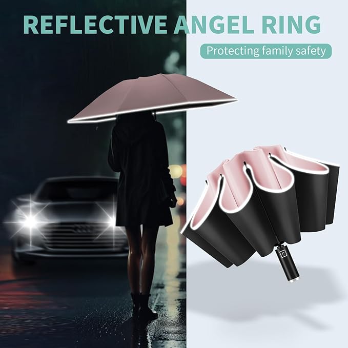 - Elevated Inverted Umbrella: Redefine your rainy day experience with Yoobure folding umbrella! Its unique inverted design allows the wet canopy to fold inside, with no splashes or drips, keeping you and the floor dry and mess-free! Plus, for added security, the travel umbrella compact features a reflective edge to enhance visibility, alerting the passing vehicles on gloomy days.