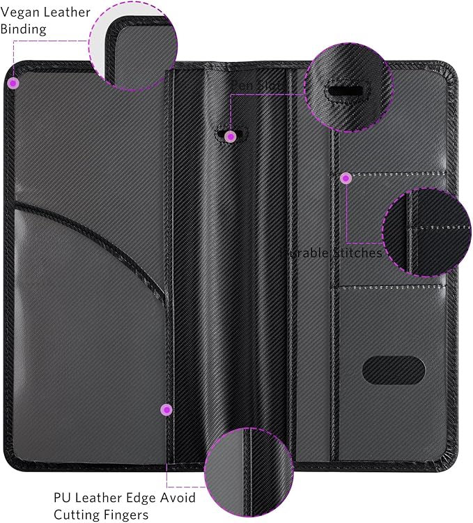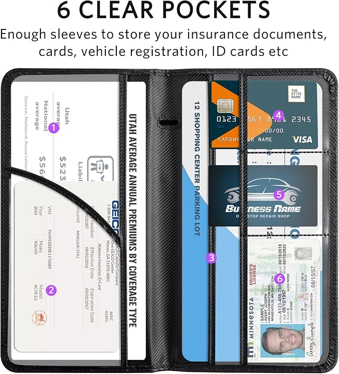 - 6 Comparments: Comes with 3 large pockets for insurance documents, vehicle registrations cards and other valueable information. And 3 small pocket for driver's license, ID cards, business cards, key contact information cards.