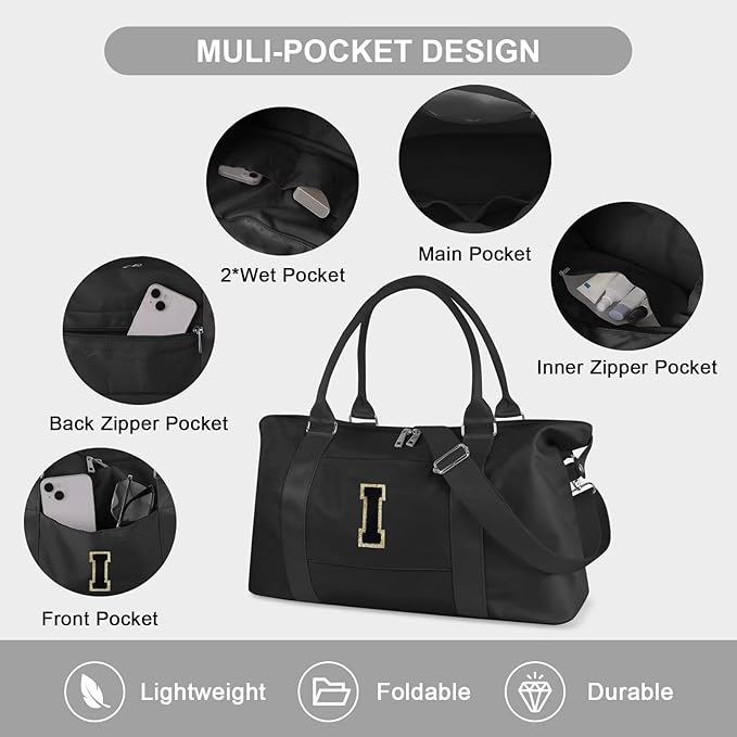 - Multi-Purpose Overnight bag: Initial gym bag is designed with 3 interior pockets & 2 exterior pockets to provide plenty of space for your belongings. In addition, this side outing bag can be folded into a rectangular size and is also equipped with a long adjustable shoulder strap to serve as a shoulder bag or crossbody bag for your daily use.