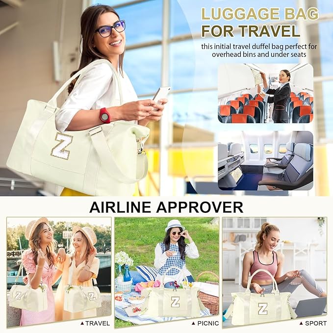 Dance Gym Duffel Bag for Teen Girls, Personalized Initial Travel Weekender Bag,Cute Overnight Carry On Duffle for Women,Sports Travel Cheer Bag,Monogram Christmas Gifts for Tween Preppy(beige-Z)