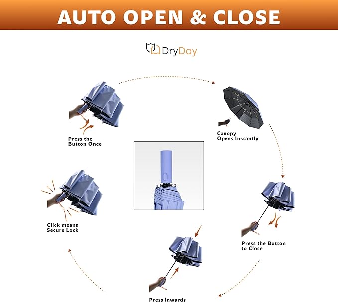 - Easy To Use Automatic Open & Close: Experience convenience on the go with the DryDay Automatic Umbrella, designed for effortless operation. This travel umbrella compact features a one-touch open and close mechanism, making it ideal for quick access in sudden downpours. As a compact umbrella for travel, it fits easily into bags and is TSA approved for worry-free trips. With the coverage of an umbrella large and the convenience of a folding umbrella, it’s perfect for those seeking reliable rain umbrellas wherever they go.