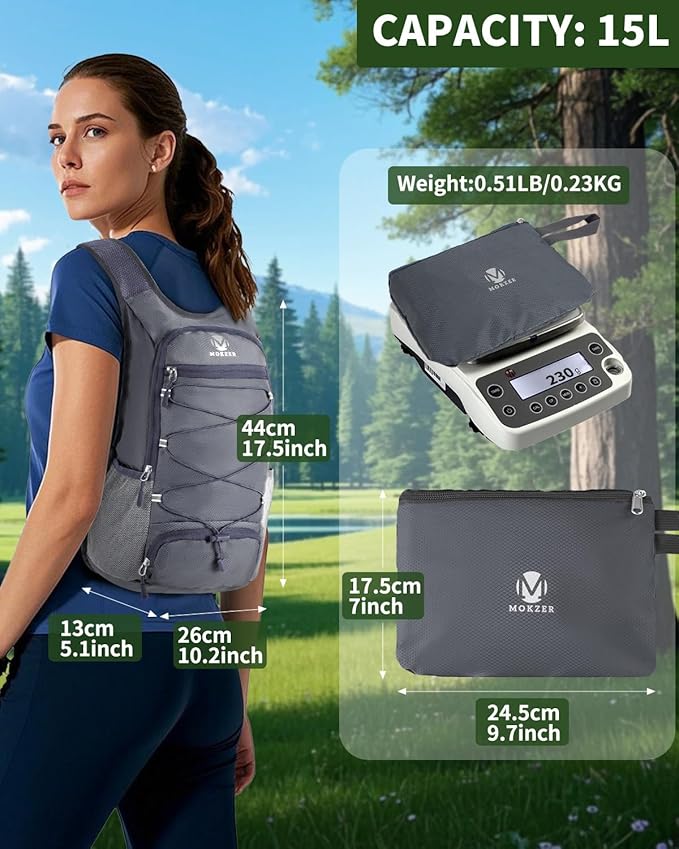 - 【Ultra-Lightweight & Compact Portability】Weighing just 230g (0.5 lbs), this packable backpack is incredibly lightweight. It folds neatly into a compact pouch, making it effortless to store in your luggage or handbag. Despite its featherlight design, it boasts a spacious 15L capacity, providing ample space for all your essentials. Whether you're traveling near or far, it's the perfect on-the-go companion to keep your journey hassle-free.