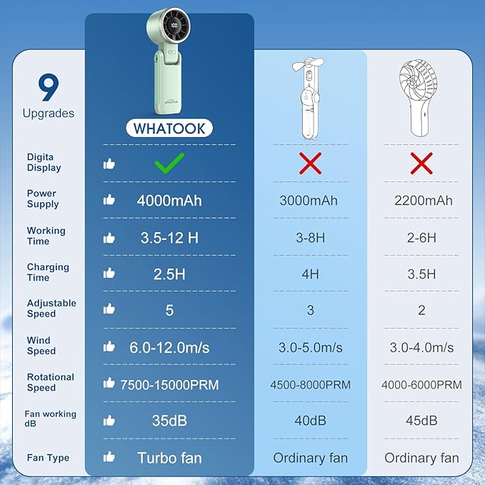 WHATOOK Portable Handheld Turbo Fan: Mini Fans with 5 Gear Wind, 4000mAh Battery Operated Rechargeable, Up to 12 Working Hours, 3 IN 1 Hand Fans for Outdoor, Travel, Working, Shopping (Green)