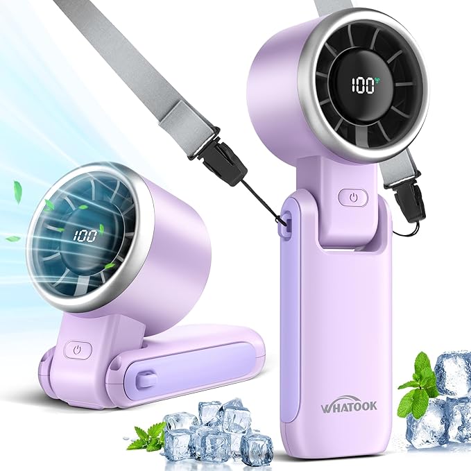 - LED Display & 5 Gear Turbo Wind: WHATOOK small fan has LED display screen,which can shows the current speed and remaining battery level. Experience personalized comfort through the adjustable wind speed settings of the travel fan