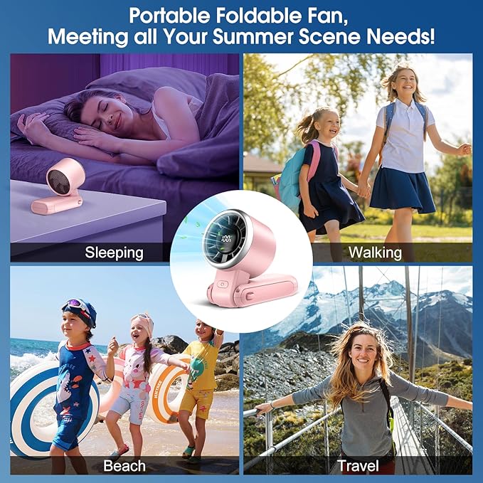 - Multi functional and portable design: 3-in-1 design, foldable for handheld, desktop placement, or neck hanging use, freeing up both hands. Small fan in size (2.28L x 1.85W x 6.61H inches), lightweight (only 0.42 pounds), as travel fan is easy to carry, suitable for various indoor and outdoor scenarios