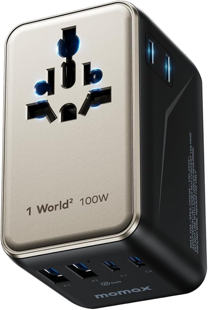 MOMAX 6-in-1 Universal Travel Adapter, GaN 100W International Power Adapter, 2 AC, 2 USB-C PD Fast Charging & 2 USB-A QC, All-in-one International Plug Adapter for Travel European UK AUS JP