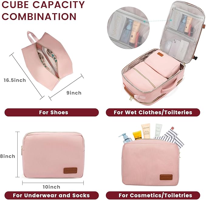 - 【WELL-DESIGNED COMPARTMENTS】This travel backpack has 4 main compartments and 3 packing cubes supplied, which enable you to keep your things in order. Your shoes, toiletries, and underwear can be placed in separate packing cubes. There is also a side pocket for bottles and umbrellas. A separate dry and wet compartment allows you to store wet towels and toiletries.