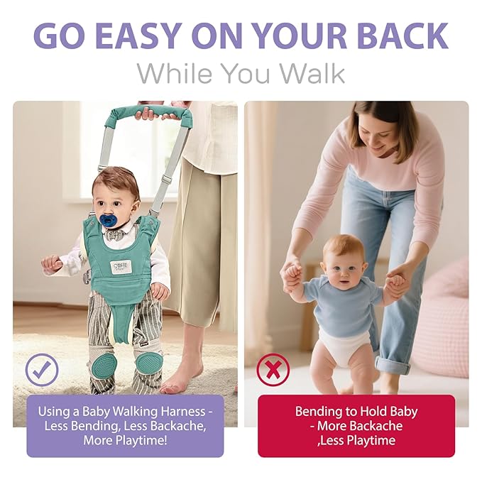 - Parent-Back Protection & Comfort:Say goodbye to stooping-induced back pain!Make your life easier and bid goodbye on painful backaches from leaning and bending over while holding your baby’s hands. With this walking harness, you can easily assist your baby’s walking without breaking your back.