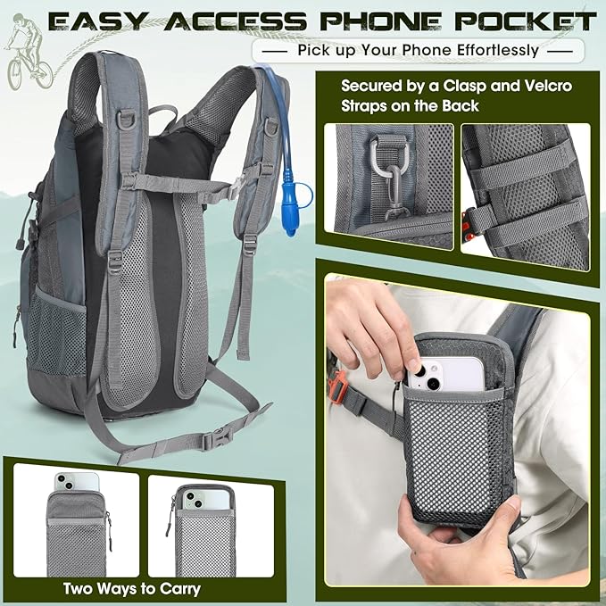 - Hydration-Ready Design: Designed for ultimate convenience, this hydration backpack features a dedicated insulated divider lined with heat-reflective material to keep your water cold for hours, perfect for adding ice pack during summer hikes. The interior features two secure clips to prevent the water bladder from shifting, while the shoulder straps have quick-access tube ports for hassle-free drinking. It comes with a 2L water bladder, perfect for those who need hands-free hydration.