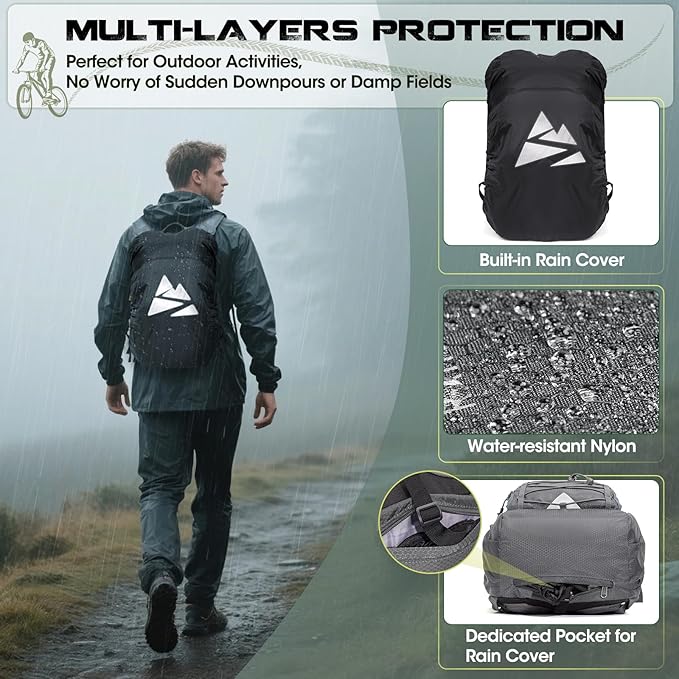 - Double Waterproof Protection: Engineered for unpredictable conditions, this Small hiking backpack adopts durable splash-proof fabric to protect your gear from light rain or spills. The included detachable rain cover provides extra protection during heavy downpours and stows neatly in a hidden bottom pocket when not in use. Whether you're caught in a sudden storm on a motorcycle ride or trekking through misty trails, this backpack ensures your belongings stay dry and secure