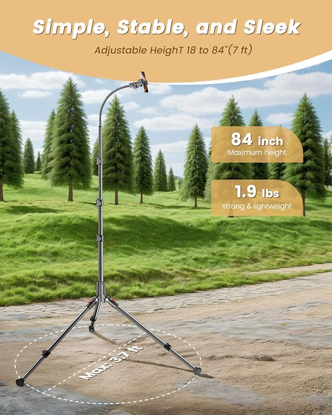- 【Lightweight Body, Superior Load Capacity】The CAMBOFOTO phone tripod weighs only 1.9 lbs yet supports up to 11 lbs. Featuring a flexible gooseneck that extends the tripod to 84 inches, it folds down to just 17.3 inches for ultimate portability.