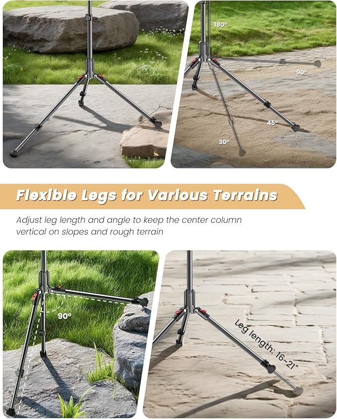 - 【Superior Stability】The extendable base diameter (up to 3.7 feet) significantly lowers the center of gravity. Aluminum two-section telescopic legs with adjustable angles and lengths. The tripod stays upright even on sloped or uneven terrain.The included counterweight hook ensures shake-free performance even in windy conditions.