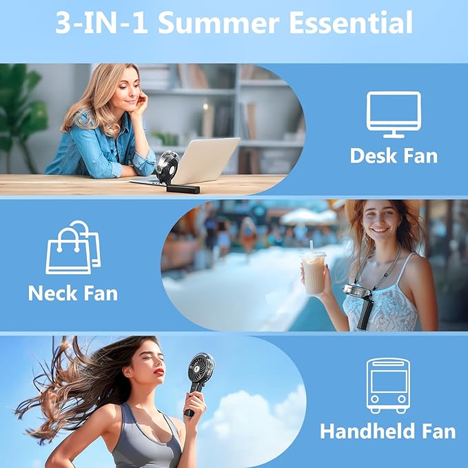 - 【Portable Design + Perfect Gift】Fan with spray mist can use as a handheld fan/hanging neck fan/desk fan. 180° foldable design fits in purses or backpacks. Ideal for commutes, camping trips, offices, or gym sessions. It’s a perfect summer gifts for Women Girl Moms, Mother's Day, Birthday.