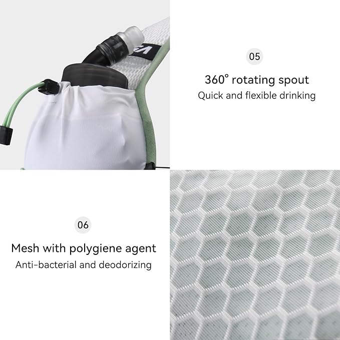 • LIGHTWEIGHT DESIGN: The backpack weight is only 230g(Medium Size), which is mainly suitable for trail running, as well as running, marathon, and light hiking. Equipped with Two 500ml TPU soft kettles, a single weight of 38g, the outward spout can rotate 360°, convenient for drinking water, when the water volume of the bottle is low, the kettle silo can be contracted, and the kettle can be stabilized without shaking, reducing interference to trail runners