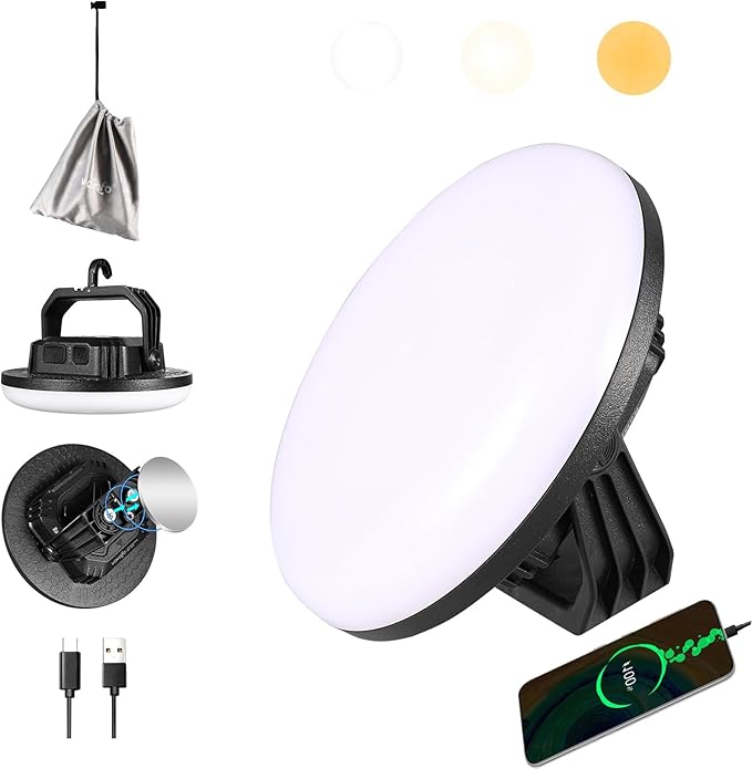 - [3 lighting modes & Stepless Dimming]: Our camping lights is dimmable, Short press to switch between 3 lighting modes (3500K/5500K/9000K), Long press to adjust brightness, providing you with the perfect lighting for any occasion, whether it's a cozy campfire setting or a bright emergency situation.