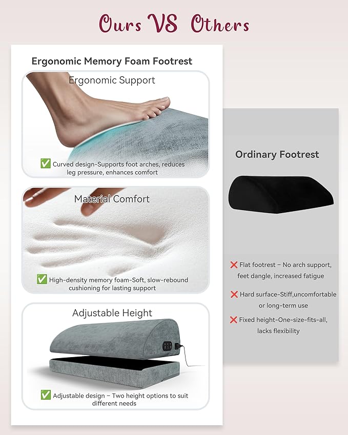 - 【Ergonomic Foot Rest for Better Posture】 This foot rest for under desk at work is ergonomically designed to support your feet and legs, helping improve posture and reduce pressure on your lower back and shoulders—perfect for long office hours or home setups.