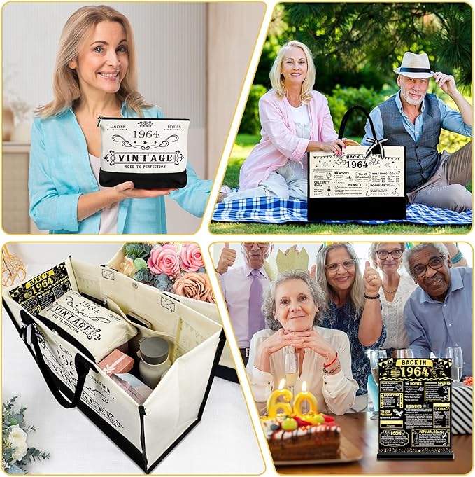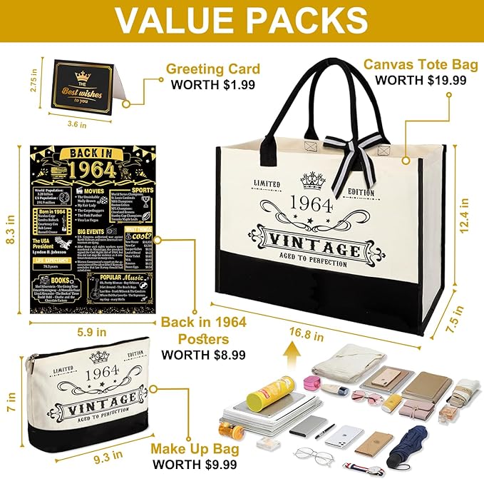 - Great Gift for Her 61st Birthday: This gifts set for 61st birthday women contains: 1 X 1964 beach bag, 1 X cosmetic bag, 1 X back in 1964 poster, 1 X greeting card. Unique canvas tote bag gifts set will be a adorable gift for women's 61st birthday. This birthday 61 gifts themed idea makes the perfect choice for putting a smile on her face on their special day.