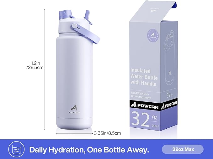 POWCAN 32 oz Insulated Water Bottle with 2-in-1 Straw and Spout Lid, Keep Cold 24H, Leak-Proof, BPA-Free, Double Wall Stainless Steel Water Bottle for Sports, Gym, Travel, and School (Lupine)