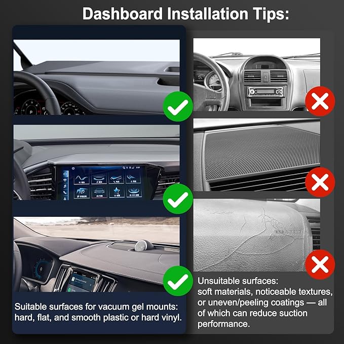 - Vacuum Lock + Gel Base — For Smooth, Flat Surfaces: Features a rotary vacuum-lock and 4-layer washable gel base that forms a rock-solid hold on flat, non-textured surfaces such as glass, glossy dashboards, or hard leather. Avoid use on curved, soft, or textured materials. To install, firmly press the gel base and rotate the vacuum lock clockwise until tight