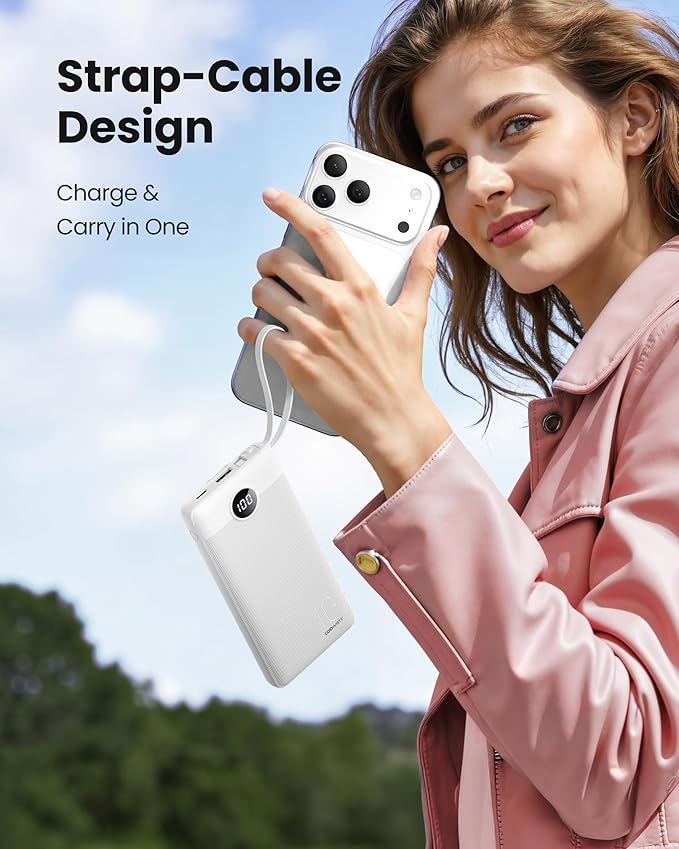Portable Charger Compatible with iPhone 17, 10000mAh Slim Power Bank with Built-in Cables, External Battery Pack 5 Outputs 2 Inputs LED Display Compatible with iPhone/Android & More (White)