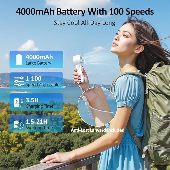 - 【100 Speeds Adjustable for Precise Cooling】Powered by a three-phase brushless motor and turbo design, this high-speed handheld fan delivers powerful airflow with a maximum speed of 9500 RPM and 23 ft/s wind speed. With 100 adjustable speed settings, you can customize the cooling experience to your preference, stay cool wherever you go