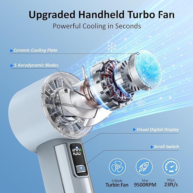 - 【100 Speeds Adjustable for Precise Cooling】Powered by a three-phase brushless motor and turbo design, this high-speed handheld fan delivers powerful airflow with a maximum speed of 9500 RPM and 23 ft/s wind speed. With 100 adjustable speed settings, you can customize the cooling experience to your preference, stay cool wherever you go