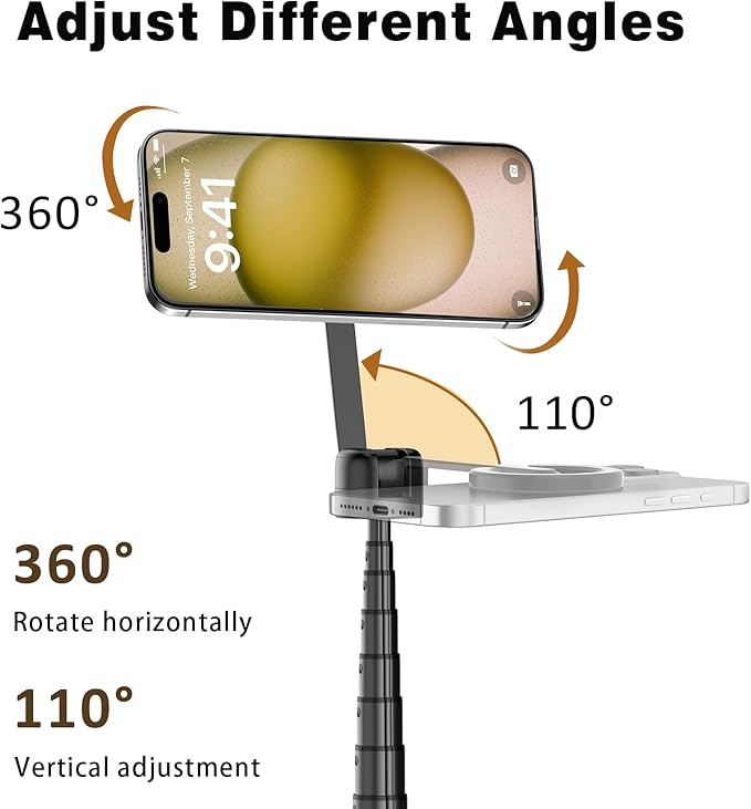 - Adjustable 360° Rotation:The phone mount allows for 360° horizontal rotation and 200° vertical tilt adjustment, giving you complete control over your phone's positioning. This flexibility of magnetic tripod for pixel 10 ensures you can capture photos and videos from different angle, whether you're shooting landscapes, portraits, or dynamic action shots.
