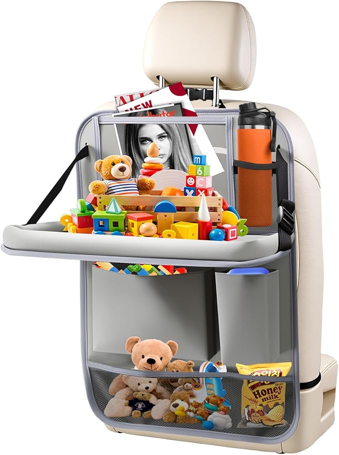 Car Backseat Organizer with Tablet Holder,6 Storage Pockets Car Storage Organizer with Foldable Food Tray,Kick Mats Backseat Protector Travel Accessories (Grey)
