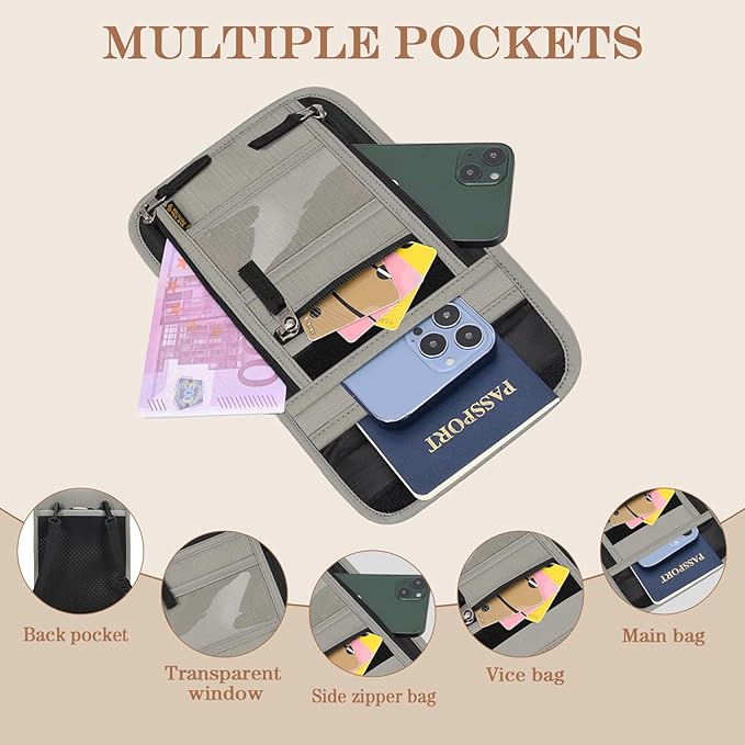 Passport Holder for Travel, Neck Pouch Travel Wallet With RFID Blocking, Waterproof Lightweight Passport Wallet for Women and Men (Gray)