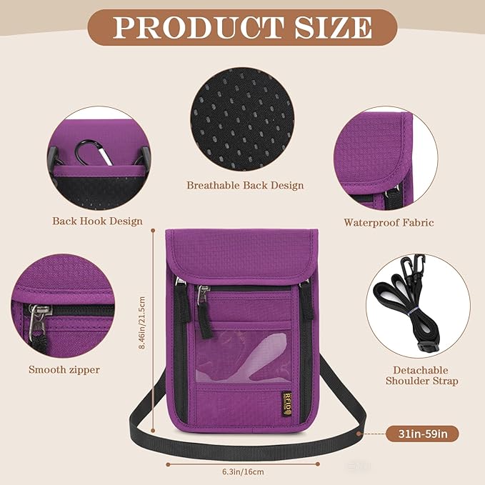 Passport Holder for Travel, Neck Pouch Travel Wallet With RFID Blocking, Waterproof Lightweight Passport Wallet for Women and Men (Purple)