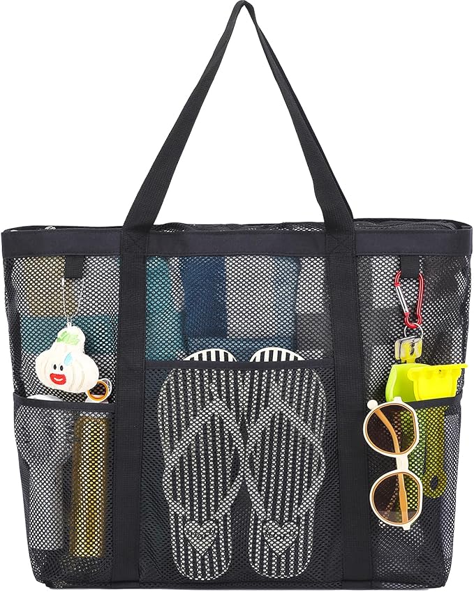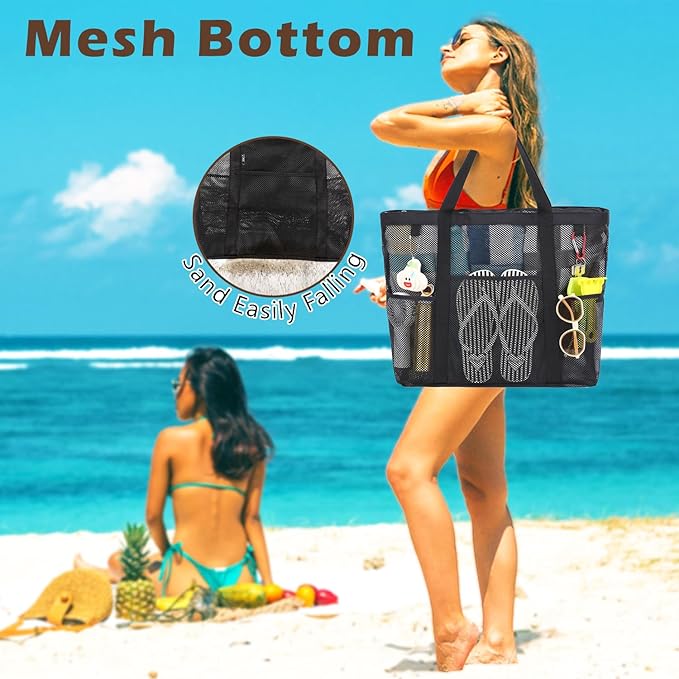 Mesh Beach Bag, Large Beach Tote with Zipper Pocket for Family Pool Bag for Toys & Vacation Essentials