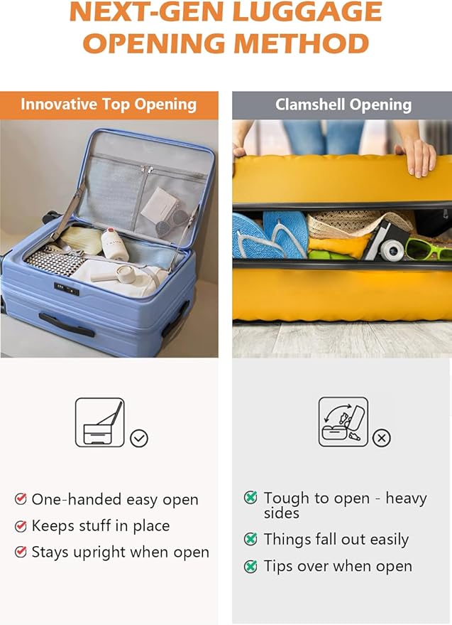 - INNOVATIVE FRONT OPENING: Experience effortless packing with our unique top-opening design. Access your belongings with ease, save space, and enjoy a more organized travel experience. Say goodbye to the inconvenience of traditional side-opening luggage.