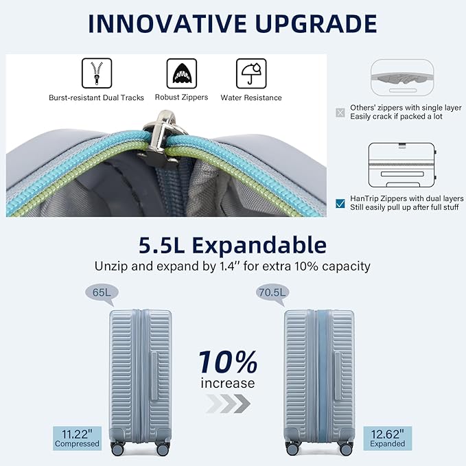 - 【Expandable Luggage Maximized Space】Measuring 26.38×17.13×11.22 inch (67×43.5×28.5CM), this luggage 24 inch boasts a built-in power bank pocket, a wet / dry seperate zone and 2 big compartments, large capacity for 5-7 days’ personal items and travel essentials. For extra room, just unzippper and expand the suitcase by 10% space. Excellent medium checked luggage for travelers of large capacity demand.
