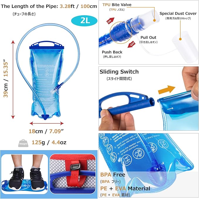 - Hydration Bladder: Made of PEVA material, 100% BPA-free, odorless, with a wide opening for adding small ice cubes. It features full compression resistance and leak-proof functionality, ensuring sufficient water supply during various outdoor activities