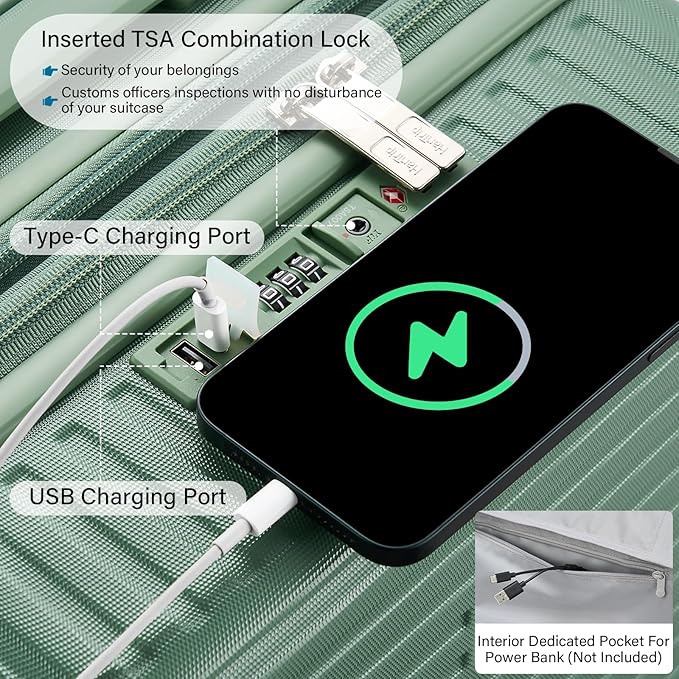 - 【Cup / Phone Holders & 2 Charging Ports】3 piece luggage set is engineered with a universal cup holder for most water bottles, coffee mugs and tumblers. Retractable dual hooks securely hold various persoanl items like phone, iPad, U-shape throw pillow, handbag, etc (up to 11 lbs). Built-in charging ports allow on-the-go power access for Type-C / USB devices (portable power bank not included). Multifuncational green luggage set to set your hands free during layover at airport / train station.