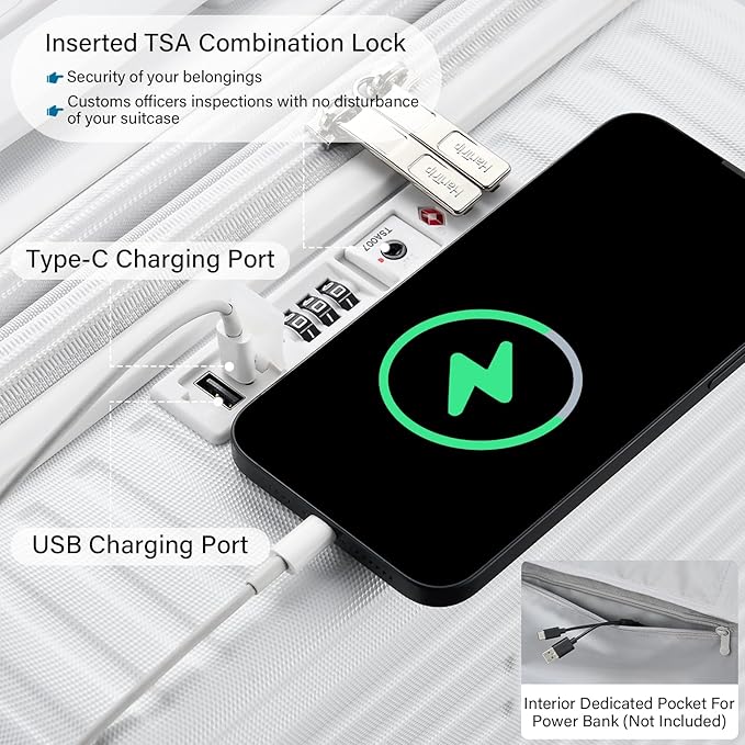 - 【Cup / Phone Holders & 2 Charging Ports】2 piece luggage sets are engineered with a universal cup holder for most water bottles, coffee mugs and tumblers. Retractable dual hooks securely hold various persoanl items like phone, iPad, U-shape throw pillow, handbag, etc (up to 11 lbs). Built-in charging ports allow on-the-go power access for Type-C / USB devices (portable power bank not included). Multifuncational white luggage set to set your hands free during layover at airport / train station.