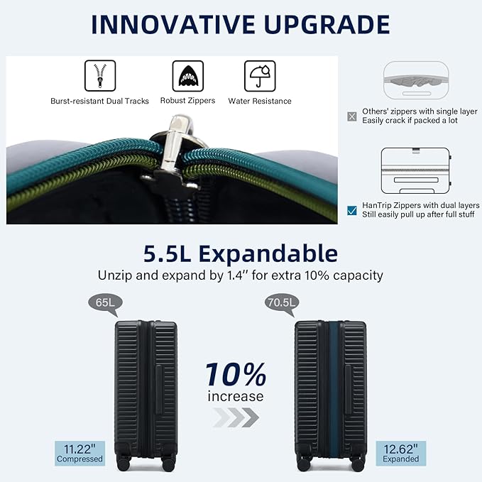 - 【Expandable Luggage Maximized Space】Measuring 26.38×17.13×11.22 inch (67×43.5×28.5CM), this luggage 24 inch boasts a built-in power bank pocket, a wet / dry seperate zone and 2 big compartments, large capacity for 5-7 days’ personal items and travel essentials. For extra room, just unzippper and expand the suitcase by 10% space. Excellent medium checked luggage for travelers of large capacity demand.