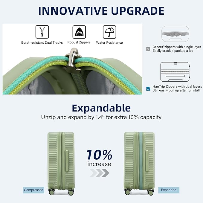 - 【Expandable Luggage Maximized Space】HanTrip two piece luggage set with spinner wheels, suitcases of both sizes boast a built-in power bank pocket, a wet / dry seperate zone and 2 big compartments, large capacity for over 10 days’ personal items and travel essentials. For extra room, just unzippper and expand the suitcases by 10% space. Excellent durable luggage set for travelers of large capacity demand.