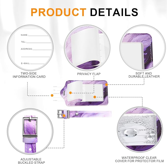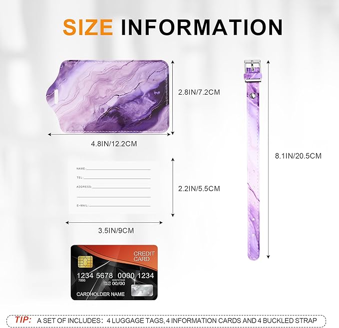 - PACKAGE INCLUDES: You'll receive a set of 4 luggage tags, suitable for both men and women. Each tag is 4.92 x 2.76 inches, with an adjustable buckled strap for secure attachment. The card slot fits standard business cards and debit cards perfectly