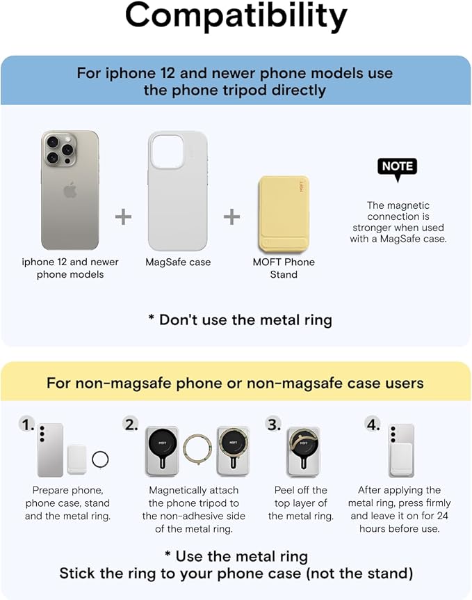 - Universal Compatibility: MOFT Phone Tripod fits iPhone 17/16/15/14/13/12 series and MagSafe cases. For other devices (such as Samsung) and non-magnetic cases, the phone stand can be attached using the included metal ring. Please check the product dimensions (3.8in X 2.5in X 0.27in) to ensure it fits the back of your phone without obstructing the camera. The slim design ensures your phone’s lenses stay unobstructed-perfect for Instagram-worthy shots at cafes, parks, or business events.