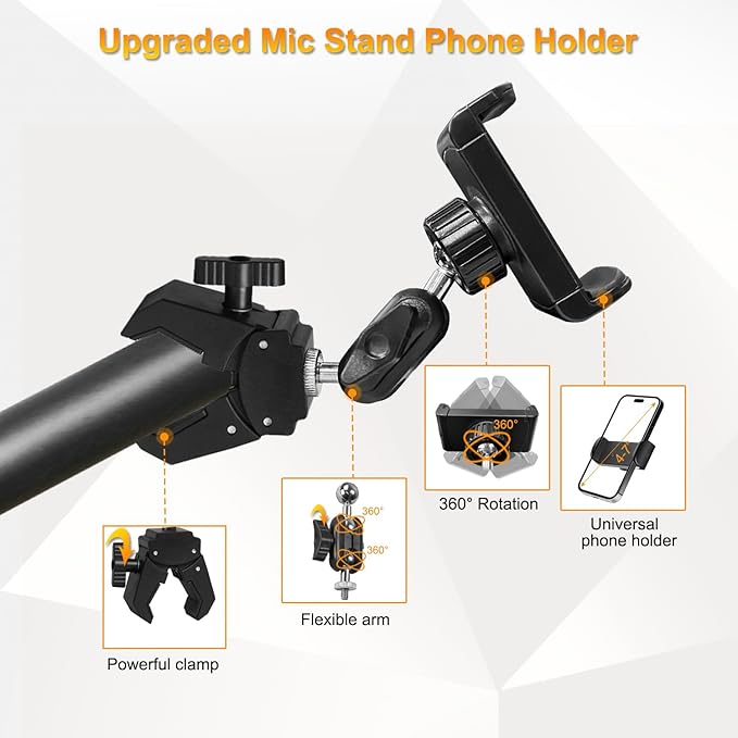 - Infinite Flexibility: Upgraded three stainless steel ball heads supports 360° flexible rotation, and can be freely tilted by 180° and locked in place by an articulating knob, ensuring precise and almost instantaneous positioning of your phone. Whether it’s vertical, horizontal, overhead, or low-angle, this iphone holder for mic stand handles it all with ease.