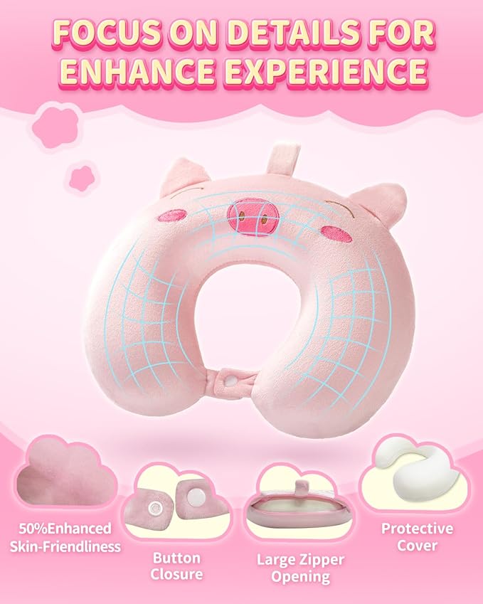 Memory Foam Kids Travel Pillow, Kids Neck Pillows for Travel Car, Cute Airplane Pillow, Washable (Pink Pig, 3-5 Y/O)