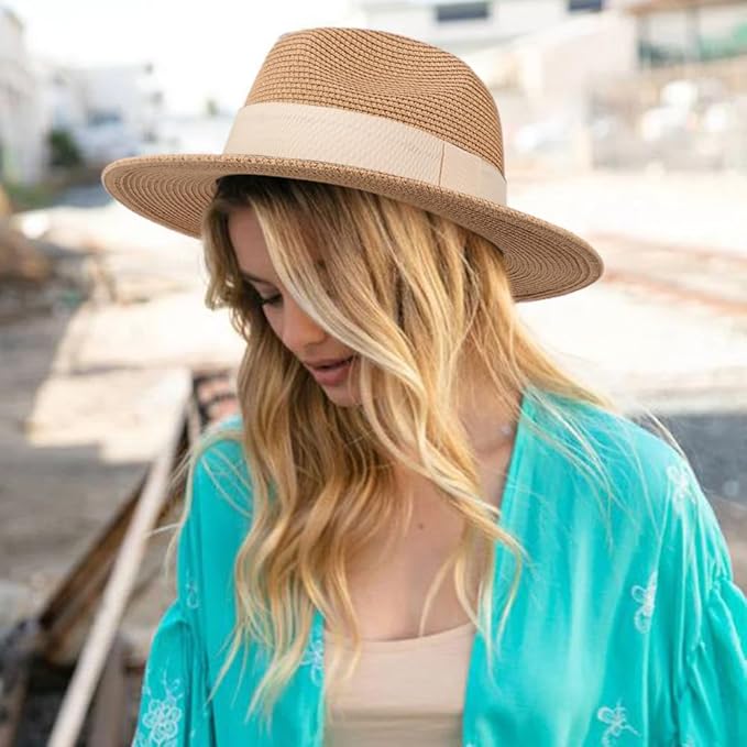 DRESHOW Women Straw Panama Hat Travel Fedora Beach Sun Hat Summer Wide Brim Straw Roll up Hat UPF 50+