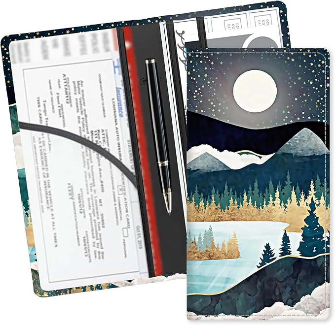 Leather Car Registration and Insurance Card Holder, Cute Car Accessories Vehicle Glove Box Car Organizer for Documents, Cards, License Beautiful Night Forest Mountain