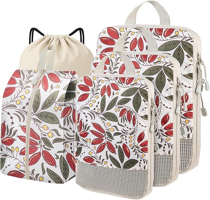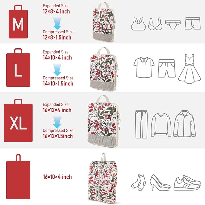 - Package Include: 1*XL Packing Cube(16*12*4 inch),1*L Packing Cube(14*10*4 inch), 1*M Packing Cube(12*8*4 inch), 1*Shoes Bag(16*10*4 inch), 1* Drawstring Bag(17.1x13.5 inch)