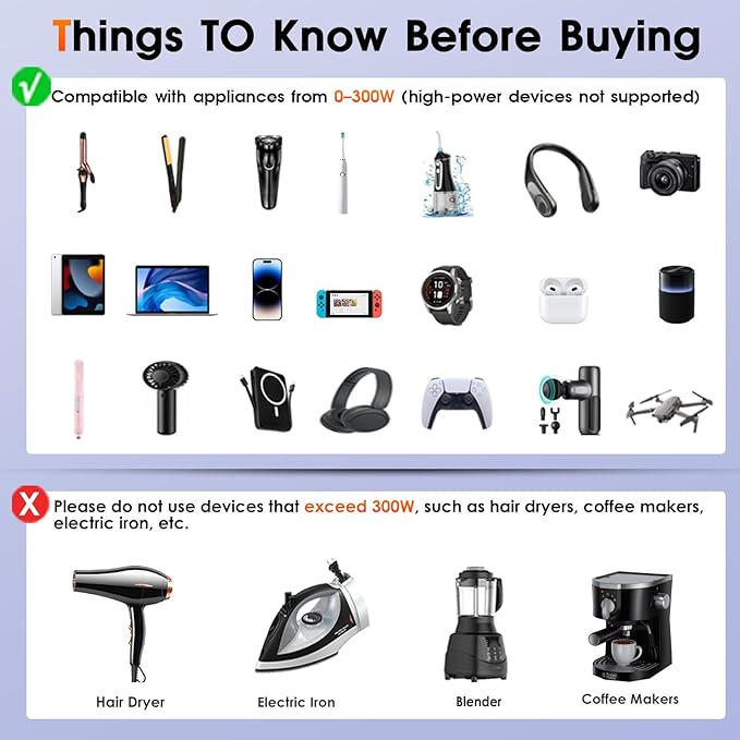 - 【300W Enhanced Power Capacity】 The advanced step down converter supports devices from 0 to 300 watts, suitable for most low to medium-power appliances, such as hair straighteners, curling irons, electric toothbrushes and electric shavers (Note: It is not intended for high-power devices above 300W such as hair dryers or electric iron)