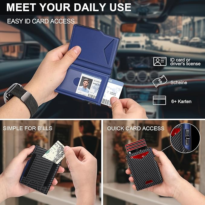 - QUICK & EASY CARD ACCESS: Unlike traditional leather wallets, SEMORID rfid wallet for men features an aluminum card case with an eject mechanism. Simply press the button and all cards pop out in a stepped pattern, making retrieval quick and convenient.