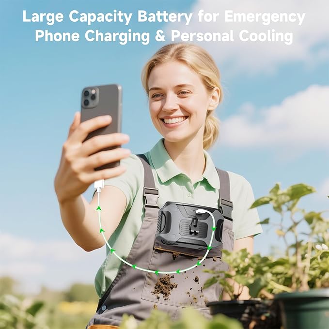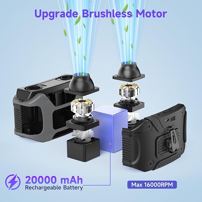 - 【Dual-Outlet 5 Speeds Cooling System】Our innovative wearable fan delivers 18 ft/s powerful airflow through dual outlets - wider coverage than single-outlet fans. The personal fan offers 5 precise speeds (up to 16,000 RPM) from gentle breeze to turbo cooling, ideal for farms, construction sites or hiking.
